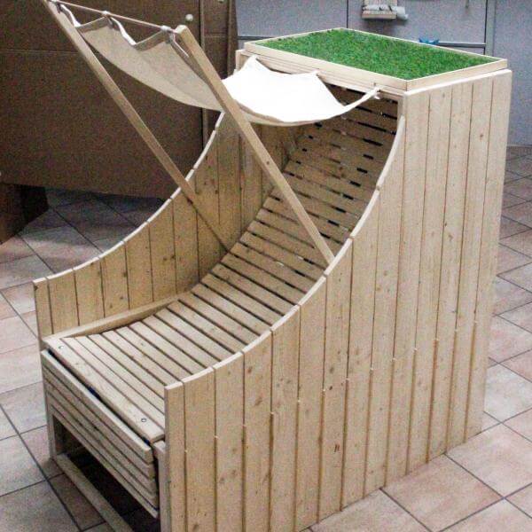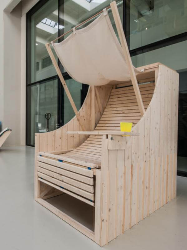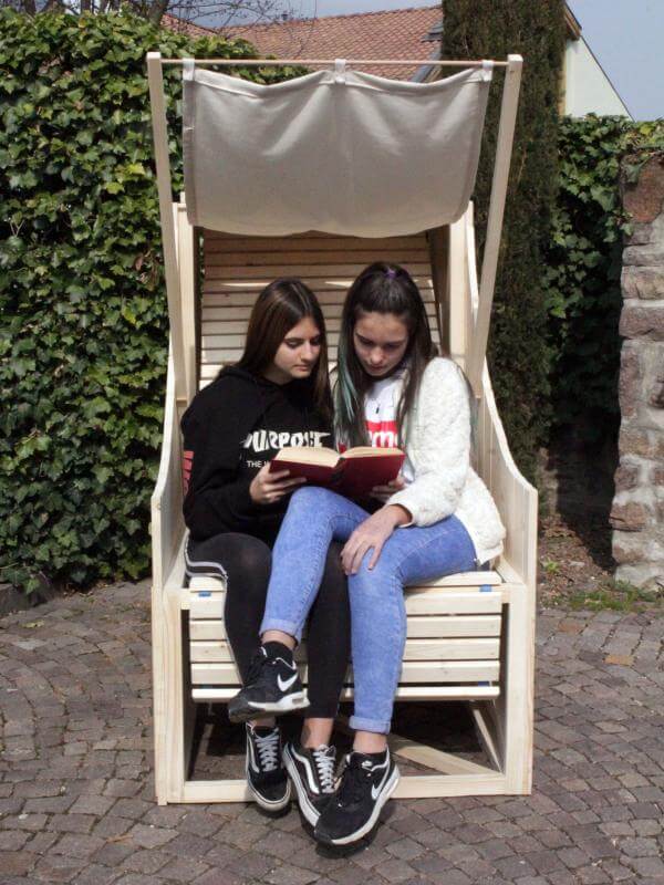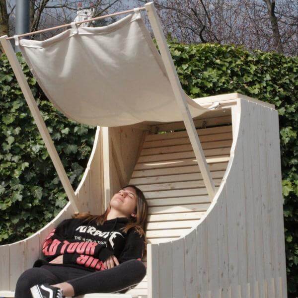 Von der Idee eines Strandkorbes ausgegangen, wurde eine Sitz- und Liegegelegenheit ausgedacht, die mehrere Funktionen beinhaltet. Die Lehne ist durch Karabiner fixiert und kann in zwei Positionen reguliert werden. Der Sonnenschutz wirft bei Bedarf Schatten und der Tisch dient als Ablage für Tablets, Handys oder Getränke. Beide Elemente sind abnehmbar und können bei Nichtgebrauch im Körper des Möbelstücks verstaut werden. Man kann auf dem Sessel alleine oder auch zu zweit entspannen.