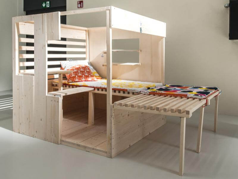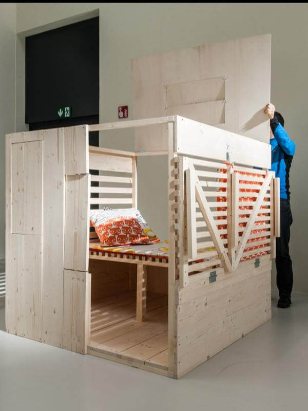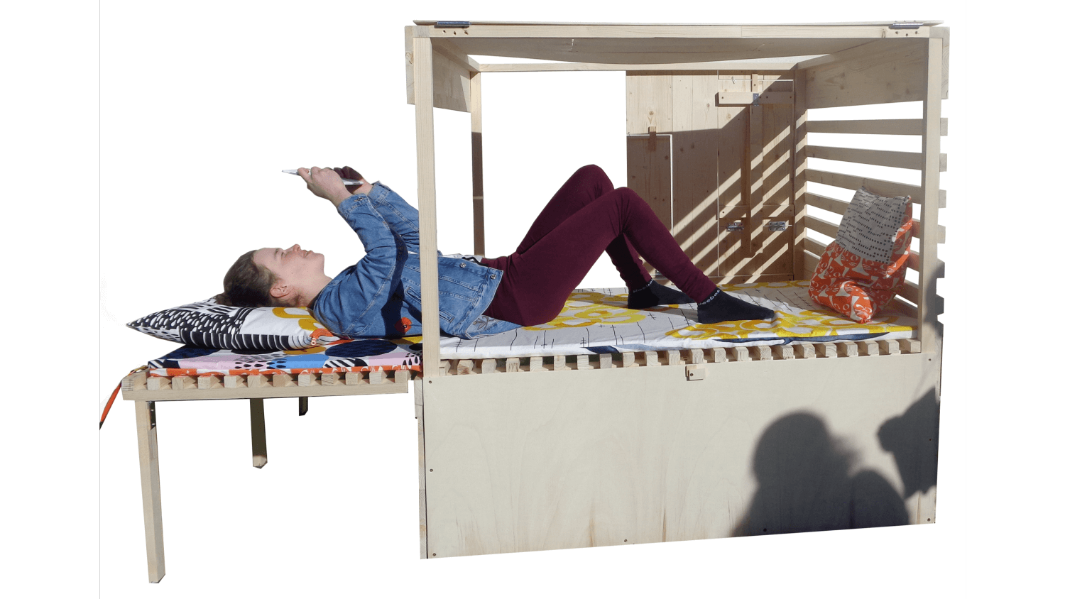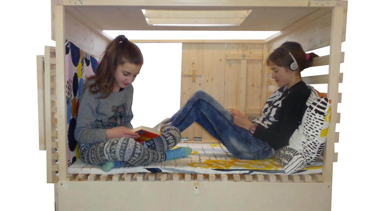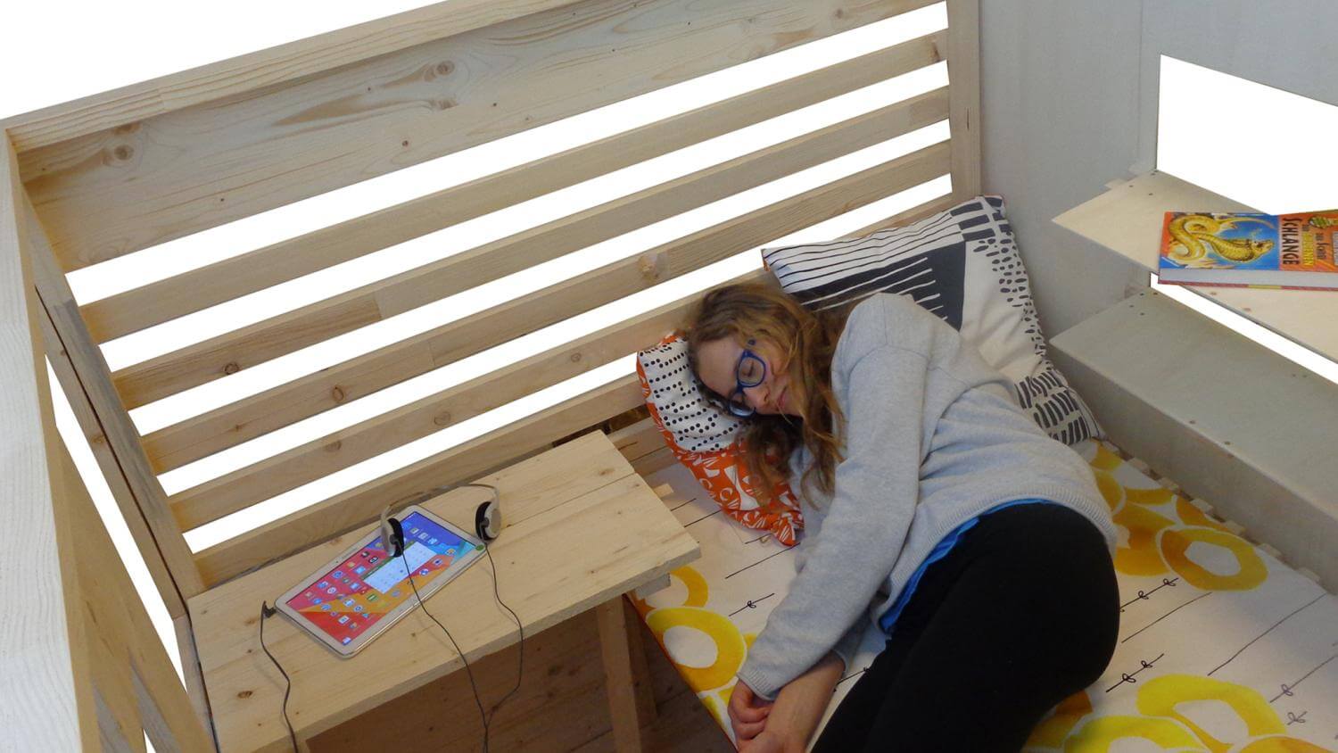 Der Würfel ist ein Ort zum Entspannen. Er kann durch verschiedene Mechanismen so umgestaltet werden, dass er zum Schlafen, Musikhören, Spielen und zum Treffen mit Freuden geeignet ist. Durch den herausklappbaren Tisch und die Klappbank wird der Dream Cube zum Spielplatz. Eine Luke zum Öffnen ist Verlängerung der Liege und zuglich Fenster. Dadurch wird der Raum ein idealer Entspannungsort, kann aber auch zum Übernachten für einen Freund dienen. Eine variable Wand, die auch zum Dach werden kann, verwandelt den Würfel vom geschlossenen Rückzugsort in eine offenen Chill-Lounge. Durch die Vielzahl der Funktionen ist der Dream Cube ideal für alle, die eine kleine Auszeit vom Schulstress brauchen.