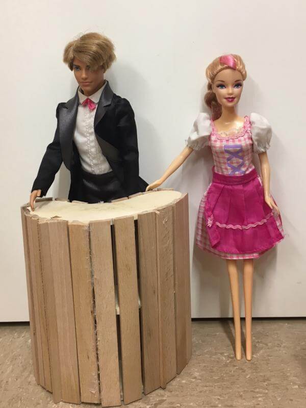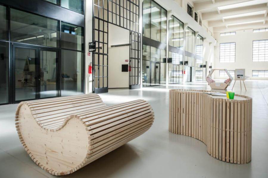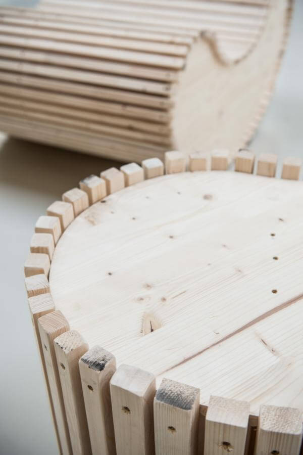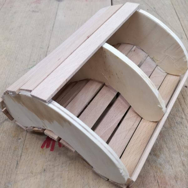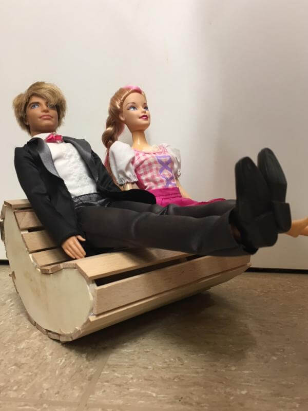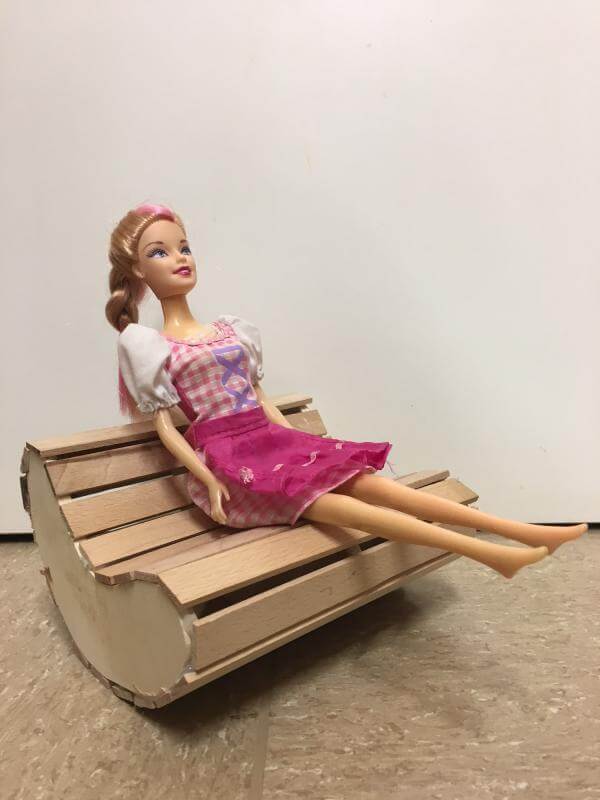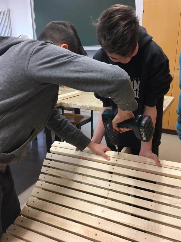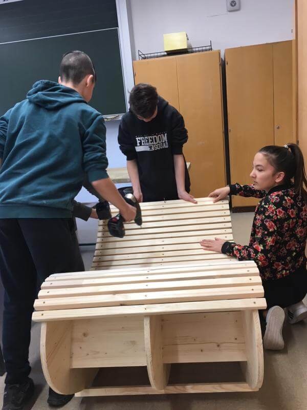 Die Schüler der Klasse 2A haben sich in der ersten Arbeitsphase in kleinen Gruppen Gedanken zum Thema „Entspannen nach der Schule“ gemacht, diese aufgeschrieben und dann Skizzen gezeichnet. Von den fünf interessantesten Ideen wurden dann Modelle im Maßstab 1:10 angefertigt. Abschließend wurde aus diesen Modellen eines zur Realisierung ausgewählt. Die Wahl fiel auf eine Liege, die in ihrer Form an eine Erdnuss erinnert und die gleich drei Funktionen erfüllt. In liegender Position kann man darauf entspannen, in liegender Position umgedreht kann man darauf Turnübungen absolvieren und in aufrechter Position dient sie als Theke für Schulfeiern und ähnliche Veranstaltungen.