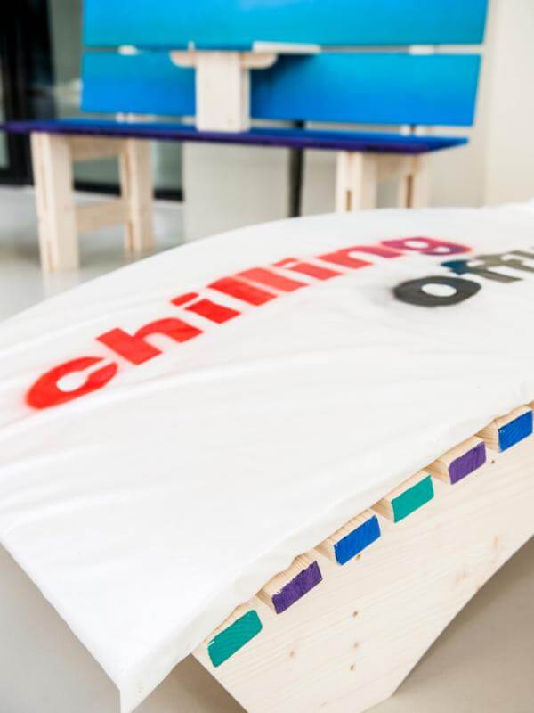 Wir führen ein lustiges Gespräch an der frischen Luft, sitzen auf unserer bunten Bank einem guten Freund gegenüber und entspannen uns gemeinsam.